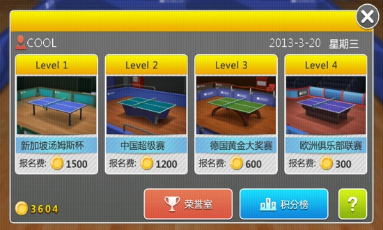 《3D乒乓球联赛》 的操作手感在同类产品中是顶尖的,真正的让你的手指化身为球拍,球随指动,下面让我们一起踏上国球之旅吧!喔噢!游戏一开始就有拿起球拍,大战一场的冲动吧?游戏画面不仅真实,同时还给人带来一种大气的感觉,心底的骄傲感也油然而生。