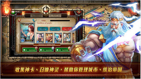 游戏还有1个特色那就是卡牌系统,玩家可以通过多种渠道来获得卡牌,例如战斗和完成任务等,卡牌其实也就是增加额外的能力,例如提高生产速度等,每张卡牌代表一位希腊神,相当有意思,除此之外,游戏还支持PXP模式,当人物达到15级后就可以进行PVP,15级之前只能相互抢夺资源,PVP开启后就可以进行军事方面的较量了,有了强大的内需,在对战其他玩家时也会更有底一些,游戏还有联盟的玩法,毕竟在利益面前没有永远的敌人,适当的结盟对自己也很有好处。